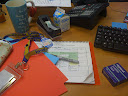 As soon as I get to my office (I am the Activity Coordinator for grades K-8) I hit the ground running. I have to have my coffee with milk and it doesn’t take long for my desk to get piled high with calendars, notes and other to-do items. I try to clean it off each day.