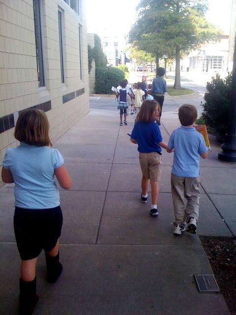 We park in a parking deck as our school does not have a parking lot and the kids love riding the glass elevator. Along for the ride are my two boys, Wylie (11) and Miles (7) and our good friend Lilly (12) who we have known since she was an infant and who carpools with us most days, and spends quite a bit of time at our house in the evenings. Together they are the three musketeers.