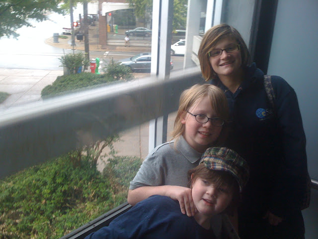 We park in a parking deck as our school does not have a parking lot and the kids love riding the glass elevator. Along for the ride are my two boys, Wylie (11) and Miles (7) and our good friend Lilly (12) who we have known since she was an infant and who carpools with us most days, and spends quite a bit of time at our house in the evenings. Together they are the three musketeers.